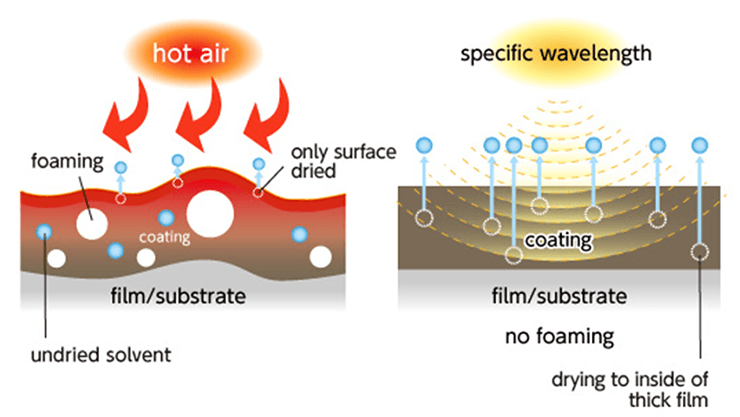An important part of the film manufacturing and processing is drying to evaporate the solvents. Due to concerns about the environment, we need to switch from organic to aqueous solvents. However, with aqueous solvents, hot air drying requires a longer processing time, and the use of high-temperature heaters tends to cause degradation of the substrate and the coating.