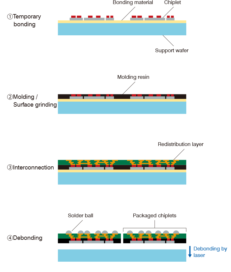 Step 1 Apply bonding material to the support wafer and temporarily fix the chiplets.