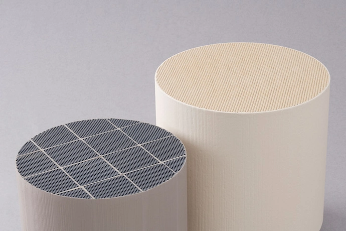 HONEYCERAM是用于承载将汽车尾气中的有害物质无害化的催化剂的陶瓷载体。NGK通过采用能以较小体积确保广大面积的蜂窝结构,手掌大小的HONEYCERAM上镀附的催化剂表面积相当于两个足球场大小。为了最大限度地提高尾气的净化效率,NGK不懈追求薄壁化和轻量化,实现了仅0.05毫米厚的超薄壁。同时也将发动机功率的损失控制在最小限度。材料采用堇青石陶瓷,可耐受尾气带来的高温和急剧的温度变化,发挥出卓越的特性。