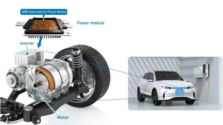 Active Metal Brazing (AMB) substrates for Power Modules enable efficient and stable operation in inverter control devices, releasing the heat which is generated by the built-in power semiconductor.