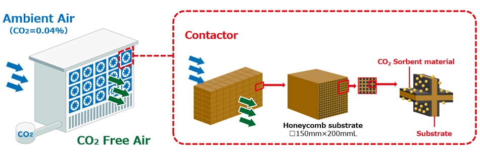 A honeycomb structure sorbent material for DAC currently being developed by NGK offers compact dimensions, large surface area, and low pressure loss (ability to efficiently treat large volumes of air) by applying the ceramic honeycomb structure technology cultivated through the development of ceramic substrates for automotive catalytic converters.