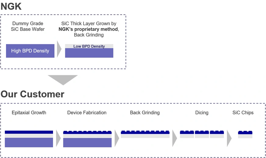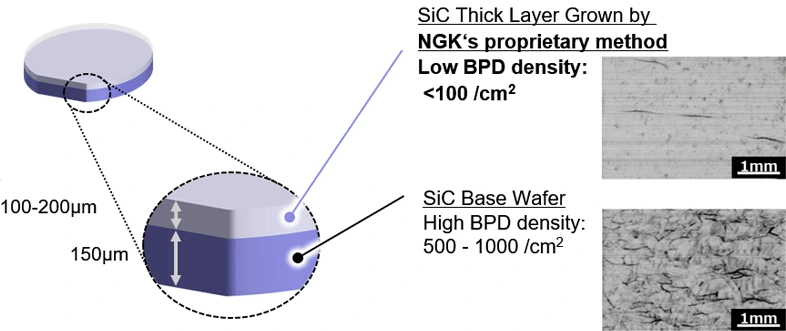 NGK has applied its proprietary crystal growth method to reduce basal plane dislocation (BPD) density, a critical defect found in silicon carbide (SiC) bulk wafers, paving the way to production of high-quality SiC wafers.