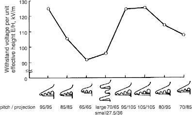 Based upon accumulated laboratory test data and field experiences regarding efficiency of leakage distance of various shed shapes for AC & DC systems, NGK has established the following standard shed shapes.