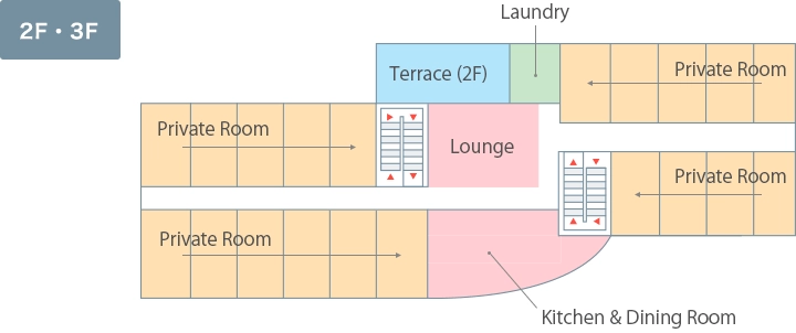 NGK International House is designed to provide international students with a safe, comfortable environment where they are free to concentrate on their studies. Each private room measures approximately 18 m2 and is equipped with a bathroom and air conditioner. Common-use facilities include a study room with ample desk space, an 85 m2 multipurpose hall for communal gatherings or parties, and a dining room with kitchen where students can cook their own food using induction cookers.